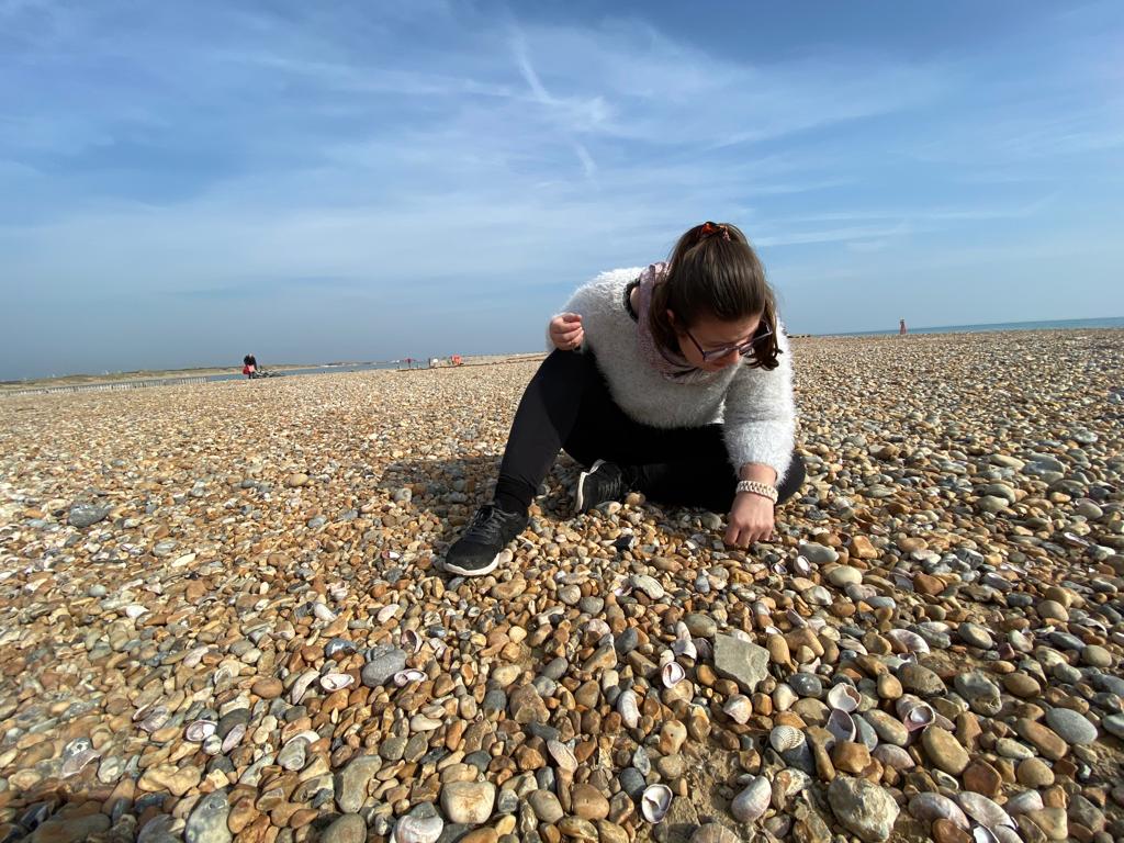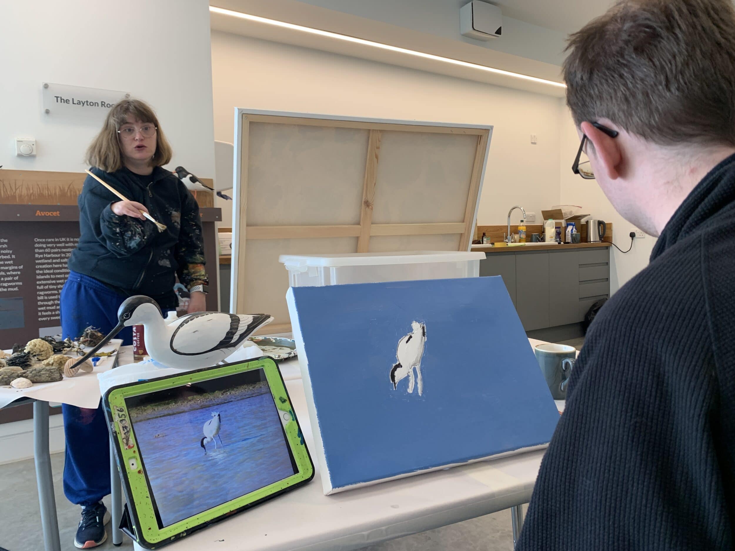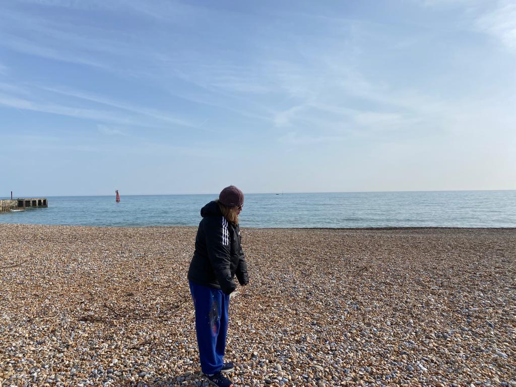 “It was a super high spring tide, I think because of full moon /equinox. We finally made it all the way to the beach which was lovely for everyone. Gaby started working on the crab shed found the previous week and it had dried out sufficiently to strengthen with a glue gun. Charlie T finished his Avocet painting and Charlie S spread paint with her hands and sand and PVA to complete her painting that has been a response to all the walks, views, sounds and found materials she’s gathered over the last 3 weeks.” Georgie Scott, Artist Facilitator